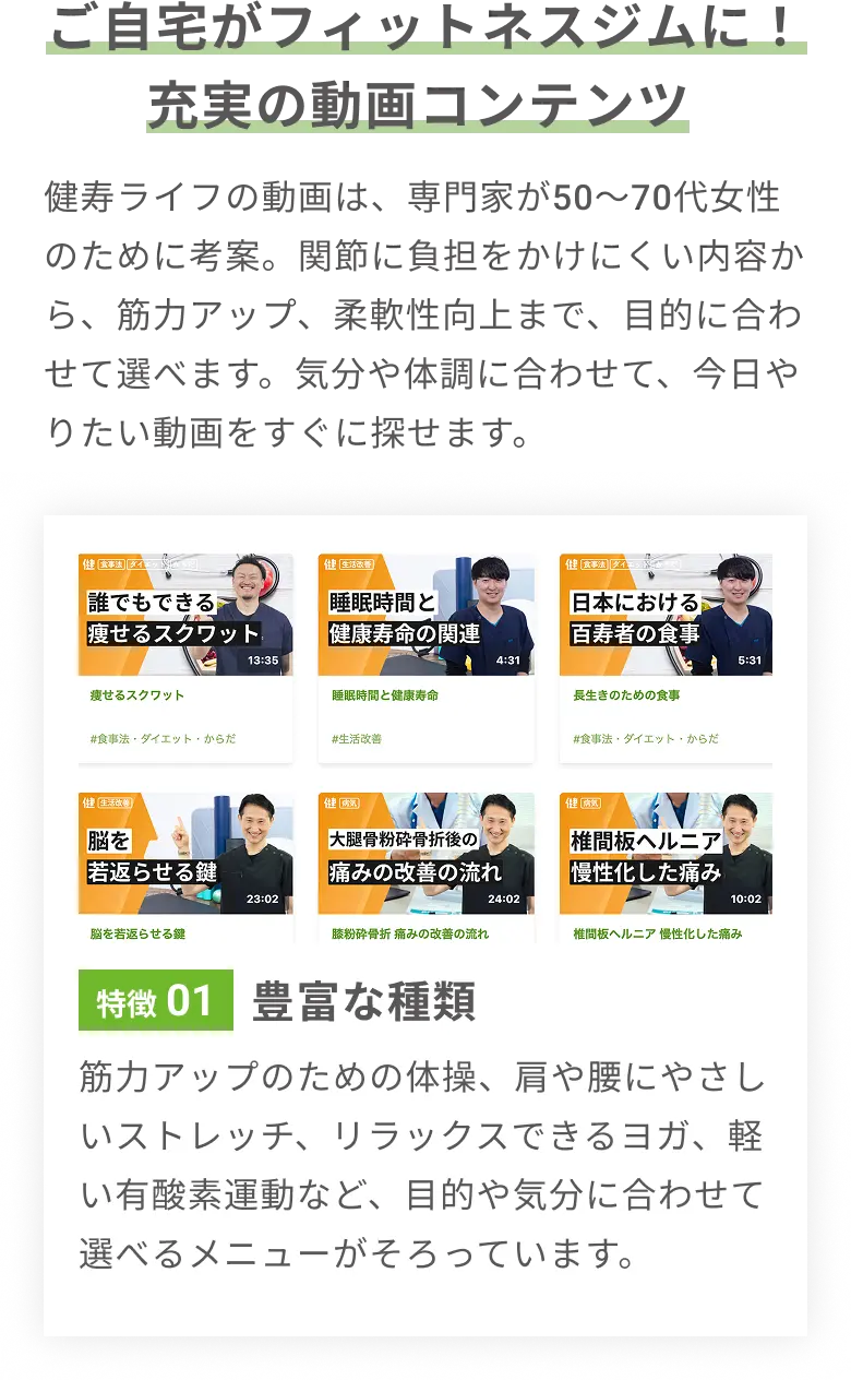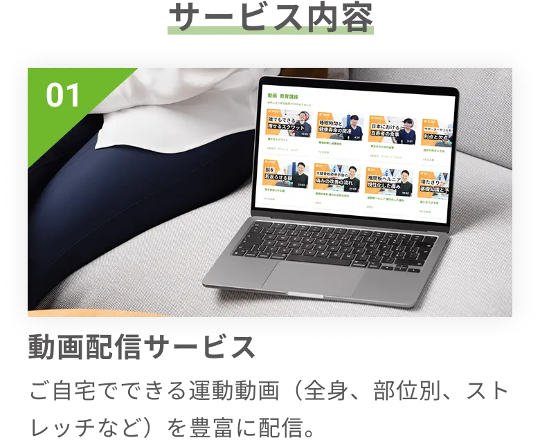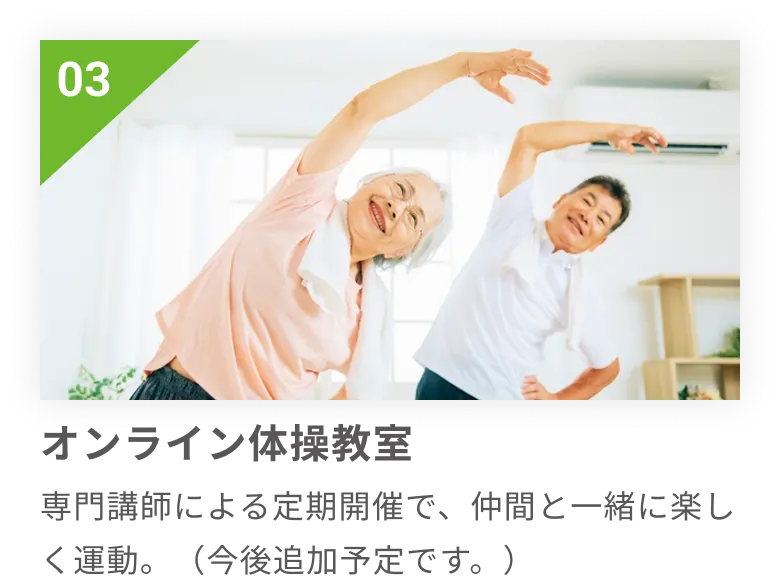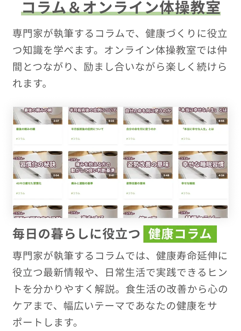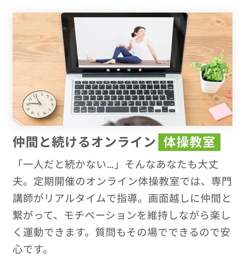 専門家監修の動画・コラム・オンライン体操教室で自宅にいながら無理なく続けられる健康習慣を。
